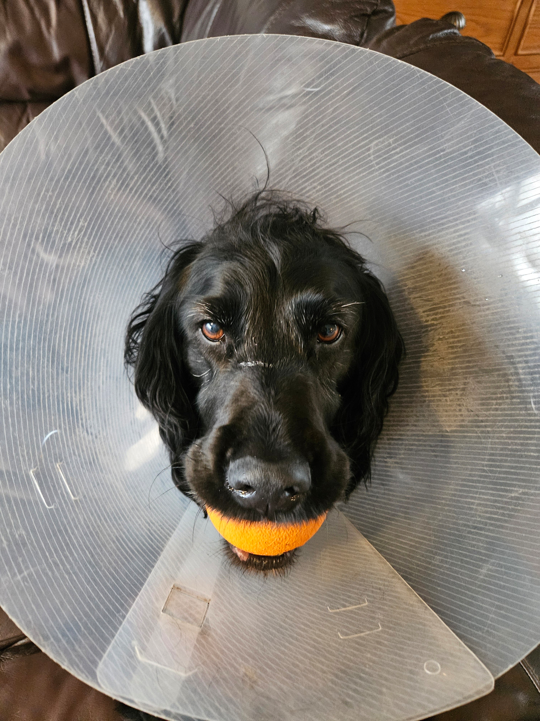 I’ve started this blog in an attempt to document my life away from the bewildering world of big social media. It’s always hard to know where to start with something like this, so here’s Ella in her cone and holding her favourite ball to get me started.